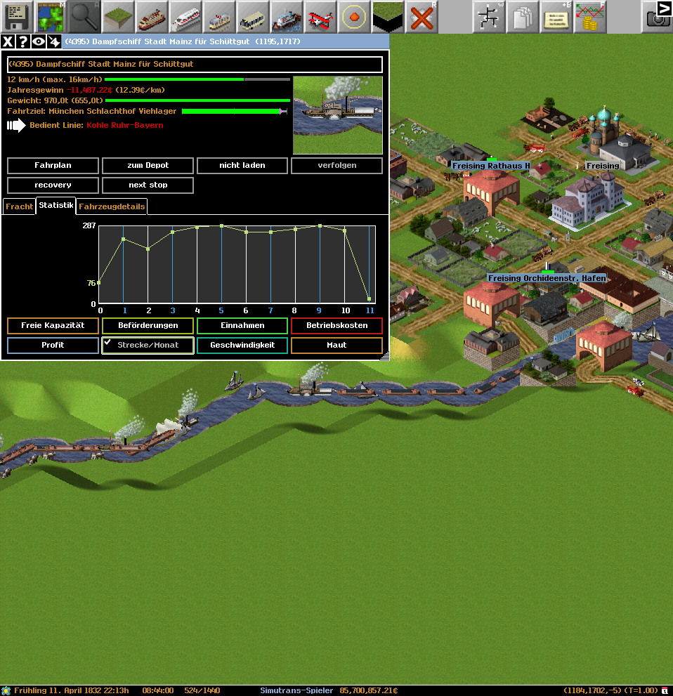 それに加えて、郵便蒸気船も登場。郵便帆船の輸送量は旅客帆船と比べて高かったので、出力としては旅客帆船に劣るものの、輸送量は1.3倍の150個。上流系統を中心に転換していきたい。