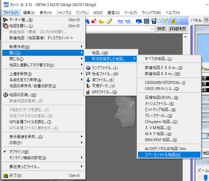 開く→形式を指定した地図…→スペースシャトル地図から、先ほどの.hgtファイルを取り込む。