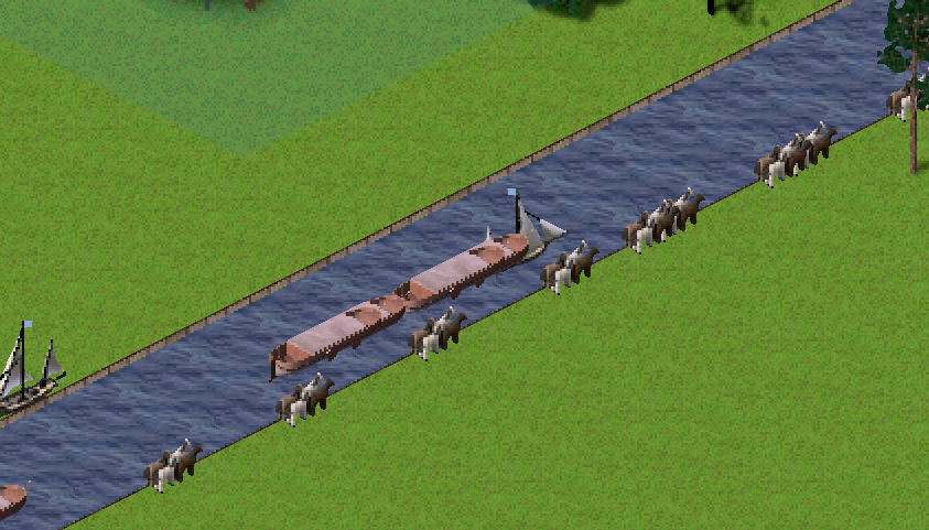 ちゃんとSimutransの馬曳船も川縁を馬が通っていますね
